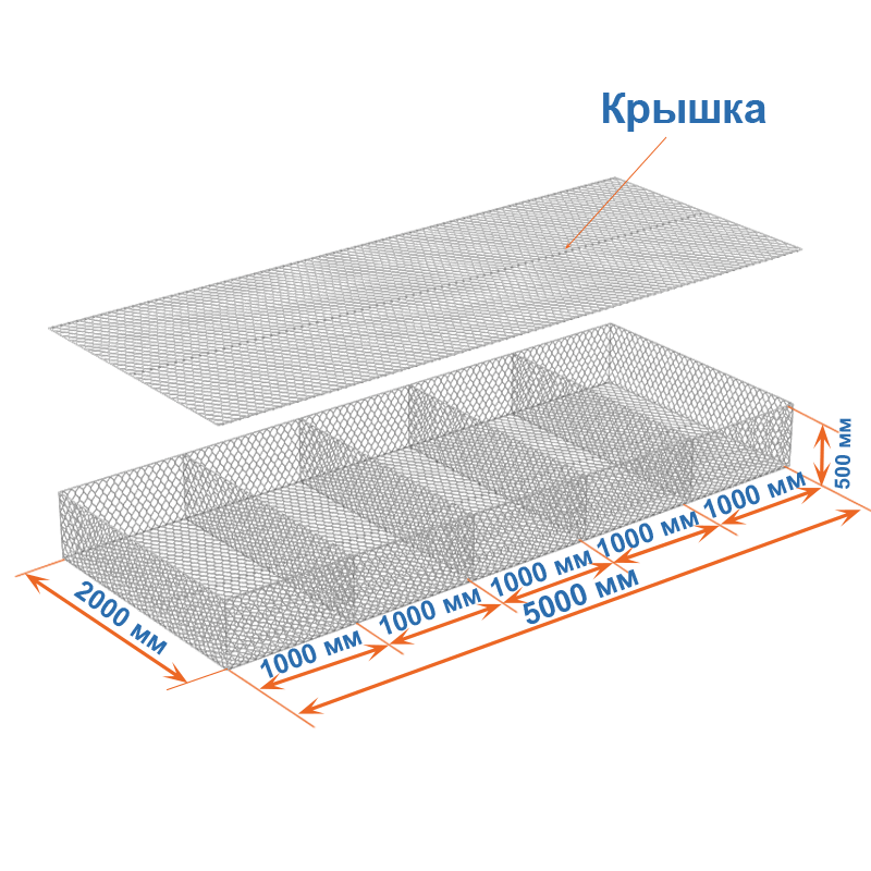 Габион матрац ГСИ-М 5х2х0,5 оцинкованный, Ø проволоки 2,7 мм, размер ячейки 8х10 см
